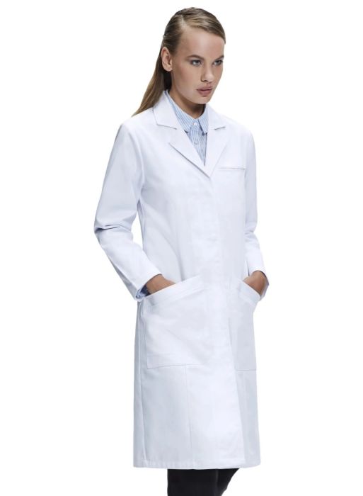 Our most popular selling lab coat for ladies is the DR1 Ladies Lab Coat. This versatile garment is designed to fit most body shapes with its relaxed and classic design. The fabric weight is 245gsm with a pre-srunk 65% polyester and 35% cotton blend making it robust and durable for any lab, medical or industrial work environment. Its absorbent material offers the user limited protection against non-chemical spills and dust to clothing underneath. The coat length is about knee high based on the average size for a women in the US of 5'4". The DR1 has 3 concealed pockets. 2 angled hip pockets and one chest pocket providing ample room for carrying all necessary elements. The garment closes over with concealed studs making it easier for quick closure and release. Suitable for wash of up to 60 degrees. Low Shrinkage.
