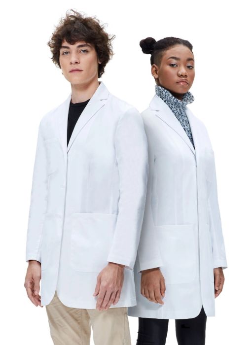 The DR13 Unisex Semi-Fitted Student Lab Coat is one of the few lab coats which has a truly unisex design. Its vertical darts, contoured seams, and curved edges highlight a modern and youthful appearance that complements both the male and female forms. We fashioned this style specifically for high school and college students where our motivating focus was on style, comfort, function, and value. This is the first lab coat on the market that delivers a perfect balance of these elements for students. The fabric weight is 200gsm with a pre-shrunk 65% polyester and 35% cotton blend making it lightweight, comfortable, and durable for any lab, medical, or educational environment. Its absorbent material offers the user limited protection against non-chemical spills and dust to clothing underneath. Suitable for wash of up to 40 degrees with low shrinkage. The coat length lies about halfway between the knee and hip area based on the average male and female height.