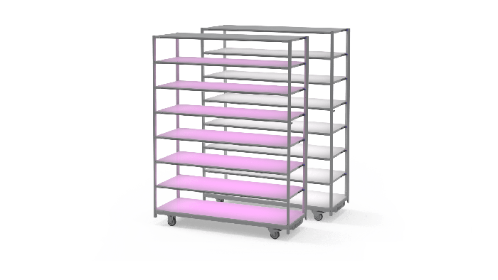 The Leaf Carrier has wheels for easy movement, and it features robust metal construction with internal cable routing and an integrated power supply unit. The minimalistic design of the LED panels, the wiring, and the frame makes them very easy to connect, clean, move and maintain.